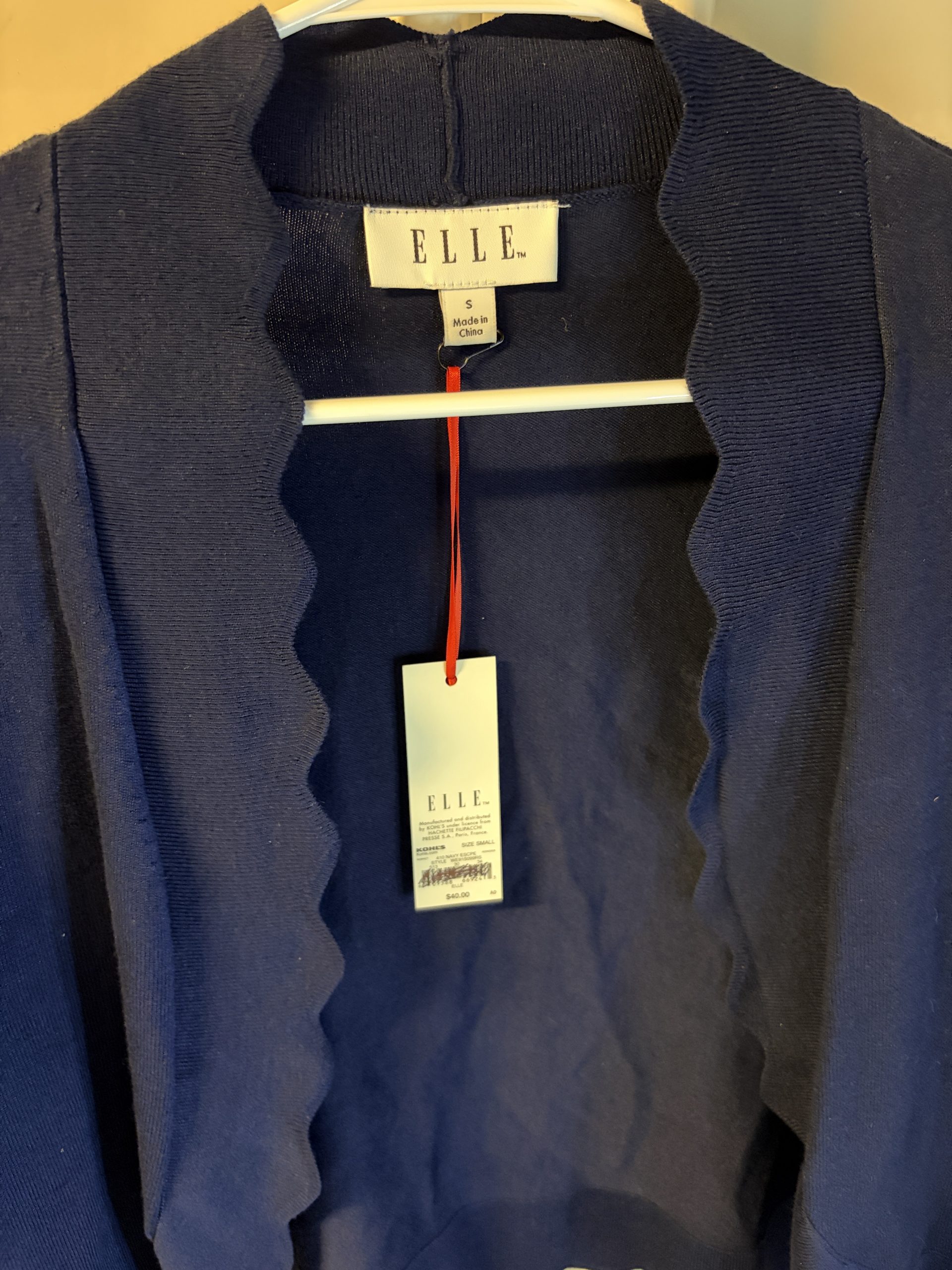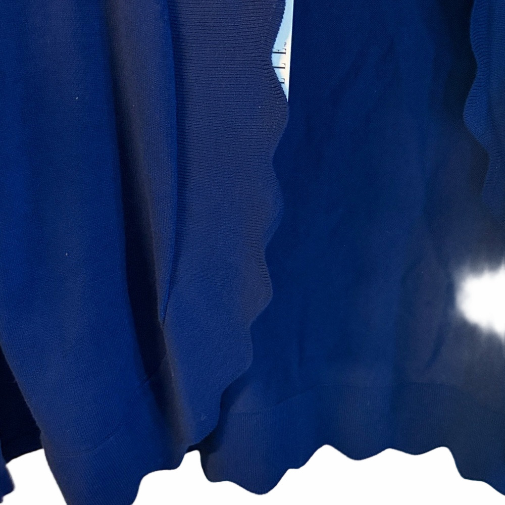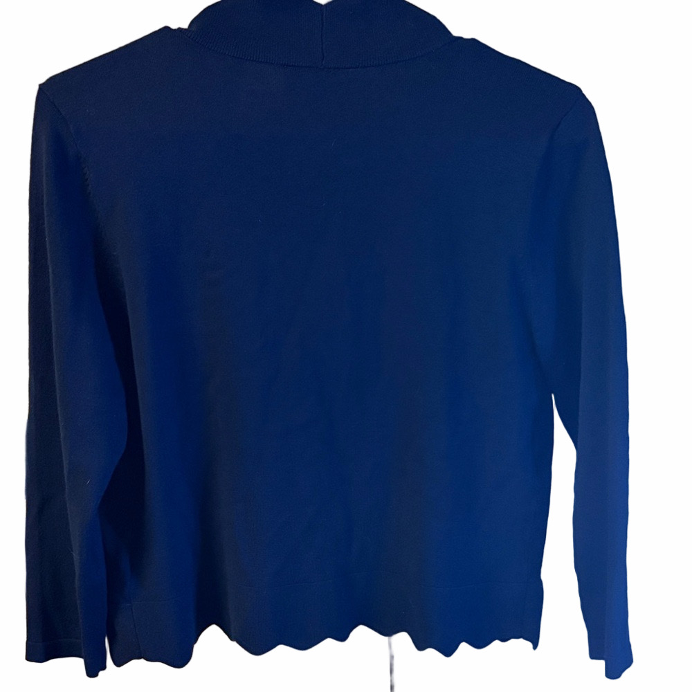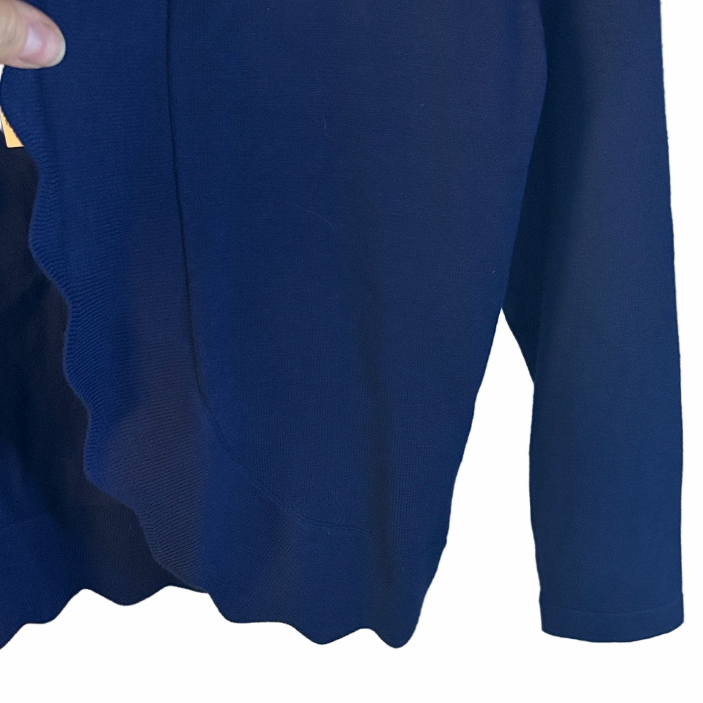 Elegant deep blue cardigan with unique scalloped trim. Ideal for layering.