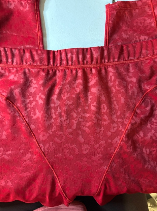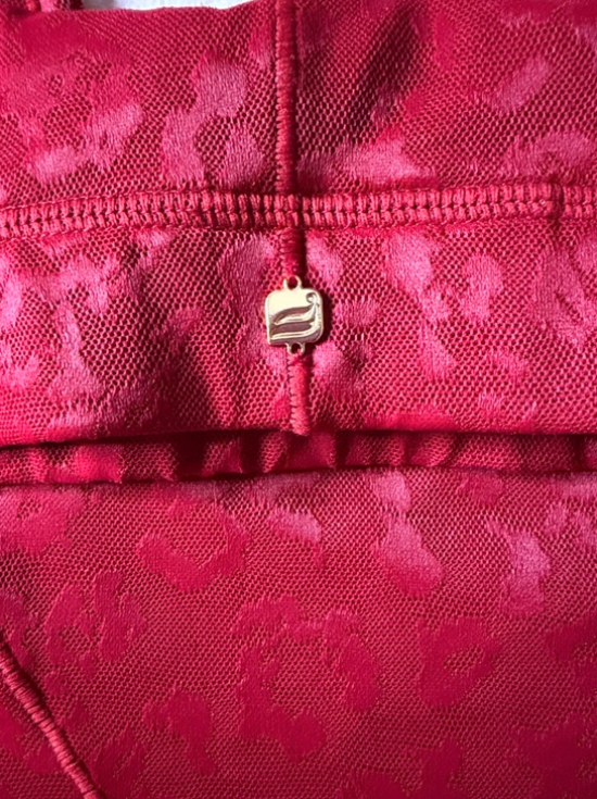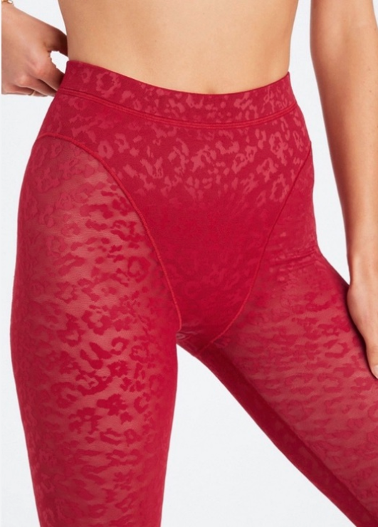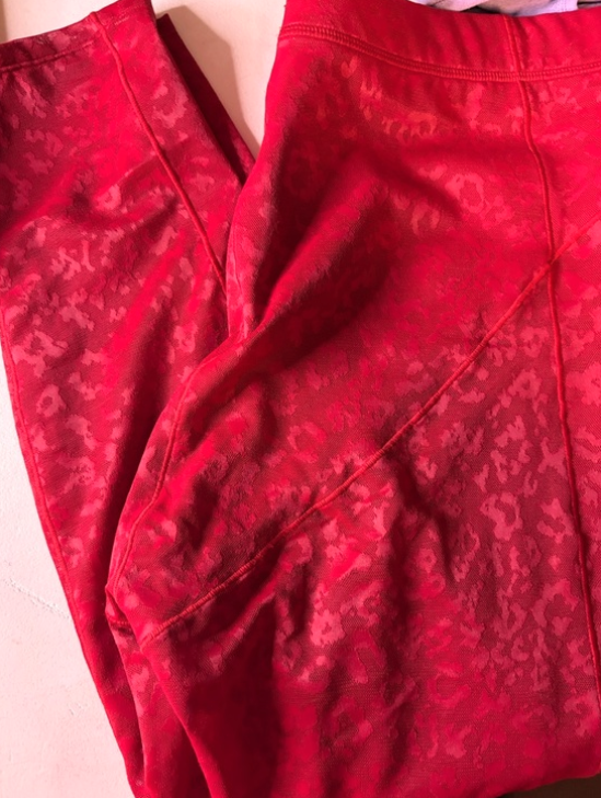 Vibrant red workout set. Seamless scoop sports bra. High-waist leopard jacquard leggings. Stretchy and fitted for movement. Stylish active look.