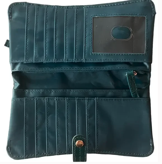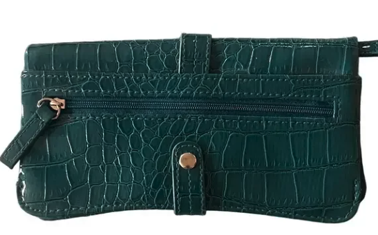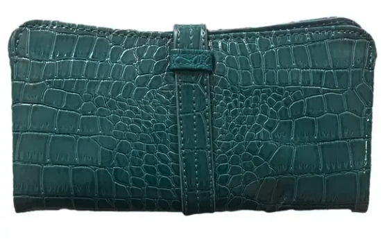 This stylish teal wallet features a sophisticated crocodile-embossed design.
